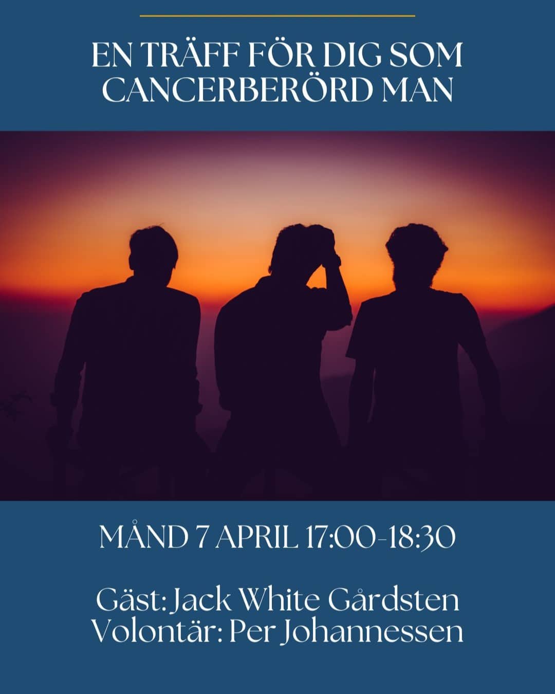 Under kvällen kan du komma och möta andra män som också är cancerberörda och har liknande erfarenhet som dig. Välkommen du som själv är drabbad av cancer – nu eller då, du som är närstående till någon och du som förlorat någon i sjukdomen.